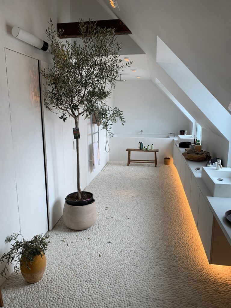Badrumsrenovering med natursten & lerkalksputs i vindsvåning.