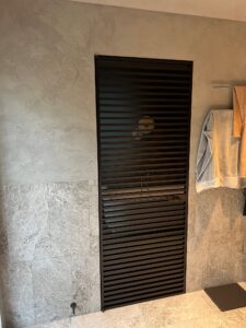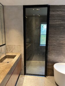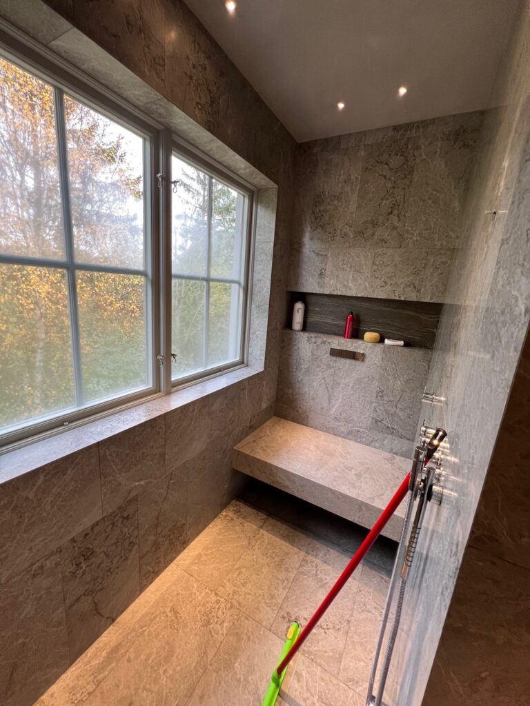 Badrummet rymmer en ångbastu komplett med takdusch – en platsbyggd helhetslösning där även dörrarna utfördes med dolda karmar för ett rent och stilrent intryck utan synliga störande element. Varje teknisk detalj, från vattentätning till finish, är utförd med samma noggrannhet som det visuella – för ett resultat som håller lika länge som det imponerar.