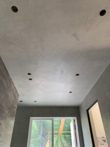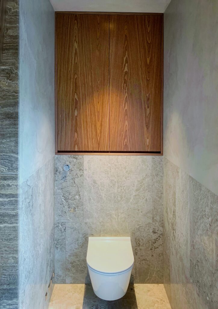 I detta projekt samarbetade vi med formgivaren Christoffer Liffner för att förverkliga ett badrum där naturmaterial och hantverksteknik möts på högsta nivå. Golvet och de stora väggskivorna i Travertin Silver sätter rummets karaktär, kompletterade av ett handfat i samma sten och skräddarsydda snickerier som maximerar både yta och estetik. Väggar och tak behandlades med dekorputs som smälter samman sömlöst med stenen för ett enhetligt och sofistikerat uttryck.