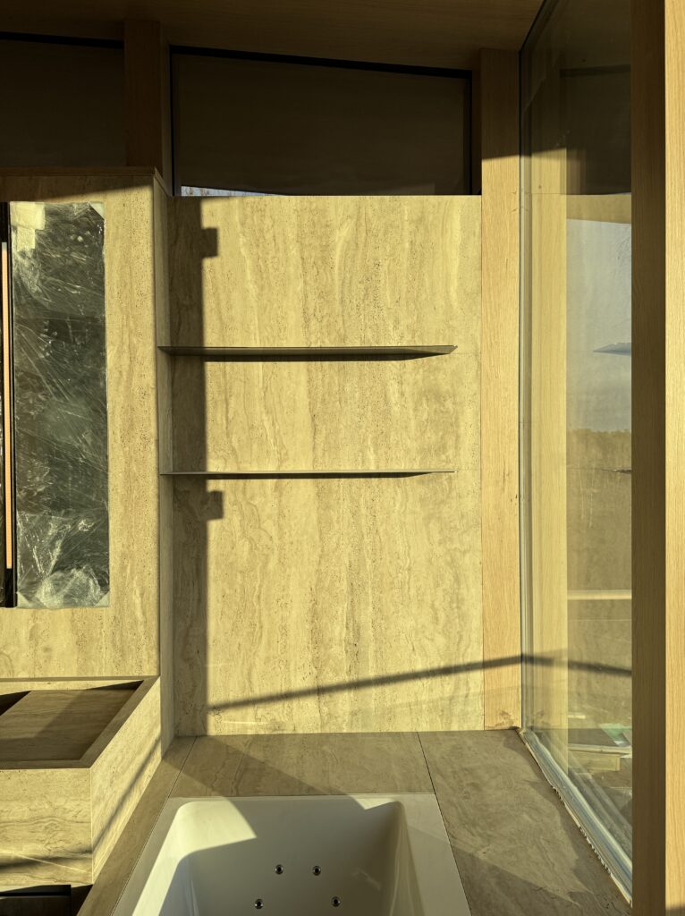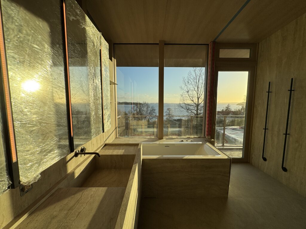 Från stomme till färdigt. Platsbyggda lösningar, inbyggt badkar och två naturstenar i ett badrum med panoramautsikt