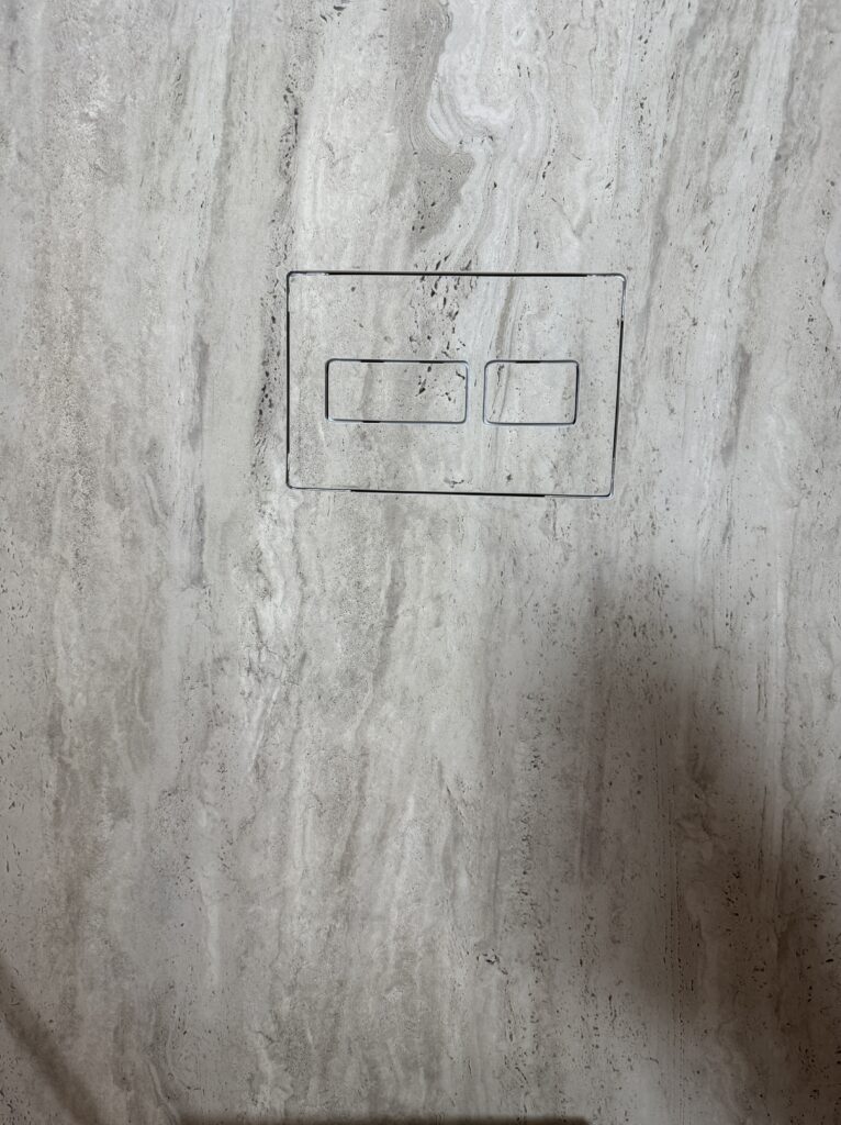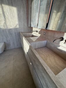 Ett komplett badrumsbygge från stomme till färdig yta – där vi ansvarade för hela kedjan från tekniska installationer och tätskikt till stenläggning och platsbyggda detaljer. Badrummen kläddes i två olika naturstenar med storformatsskivor på både väggar och golv, vilket ger ett rent och tidlöst uttryck med minimala fogar.