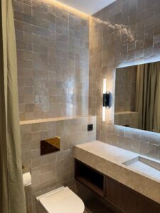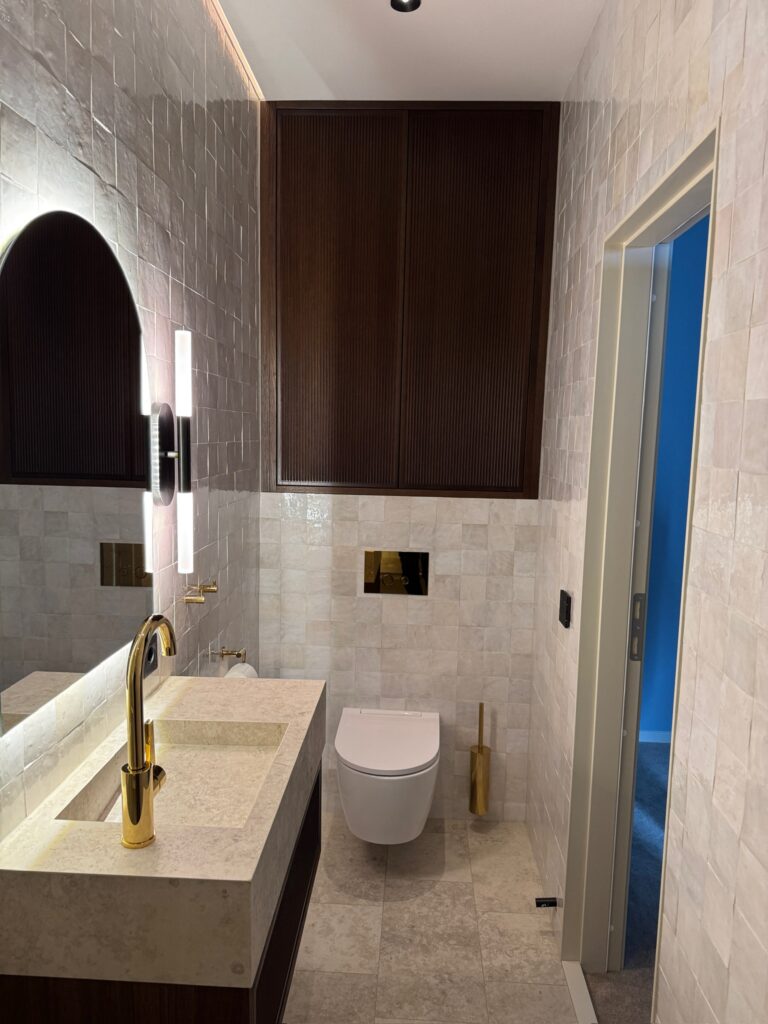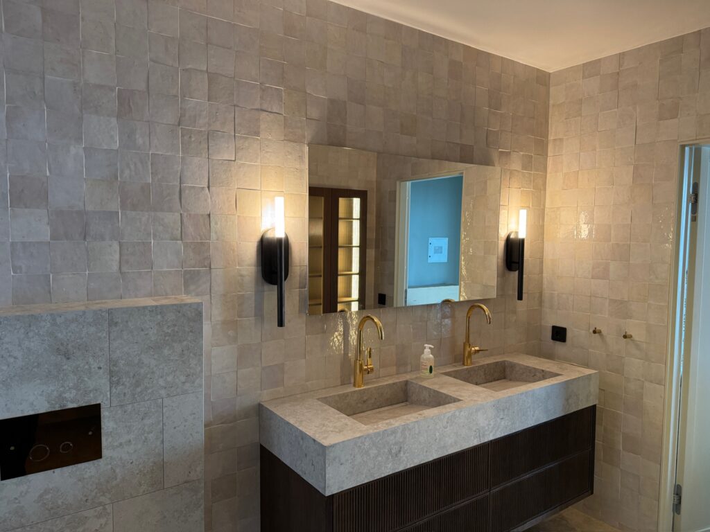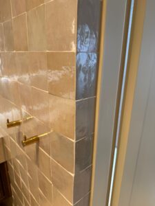 I detta projekt på Gustavsborg renoverades tre badrum med zellige-kakel som gemensam nämnare – i varierande nyanser från varm beige till svalare grå. Kakelns levande yta och oregelbundna glasyr ger varje rum ett organiskt och tidlöst uttryck som skiljer sig från konventionell kakel. Golven utfördes i natursten som kompletterar kaklens varma undertoner.