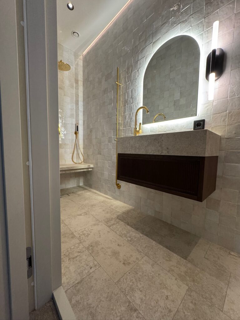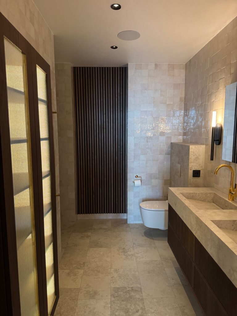 I samtliga badrum löper guldtonad armatur som en genomgående detalj – från regndusch med inbyggd naturstenbänk till handfatsblandare. Platsbyggda stenhandfat, integrerade hyllor och indirekt belysning längs taklisten binder samman rummen till genomtänkta helheter med hög finish.