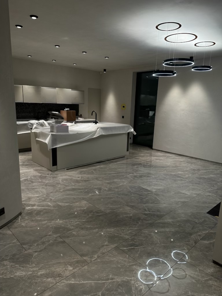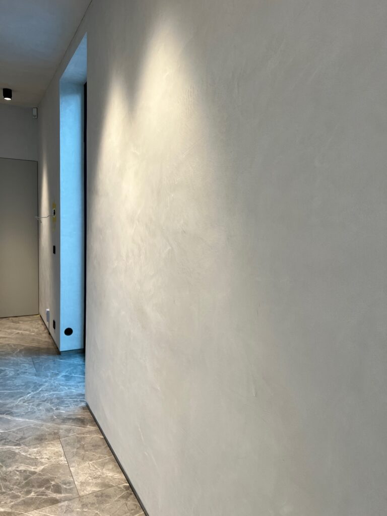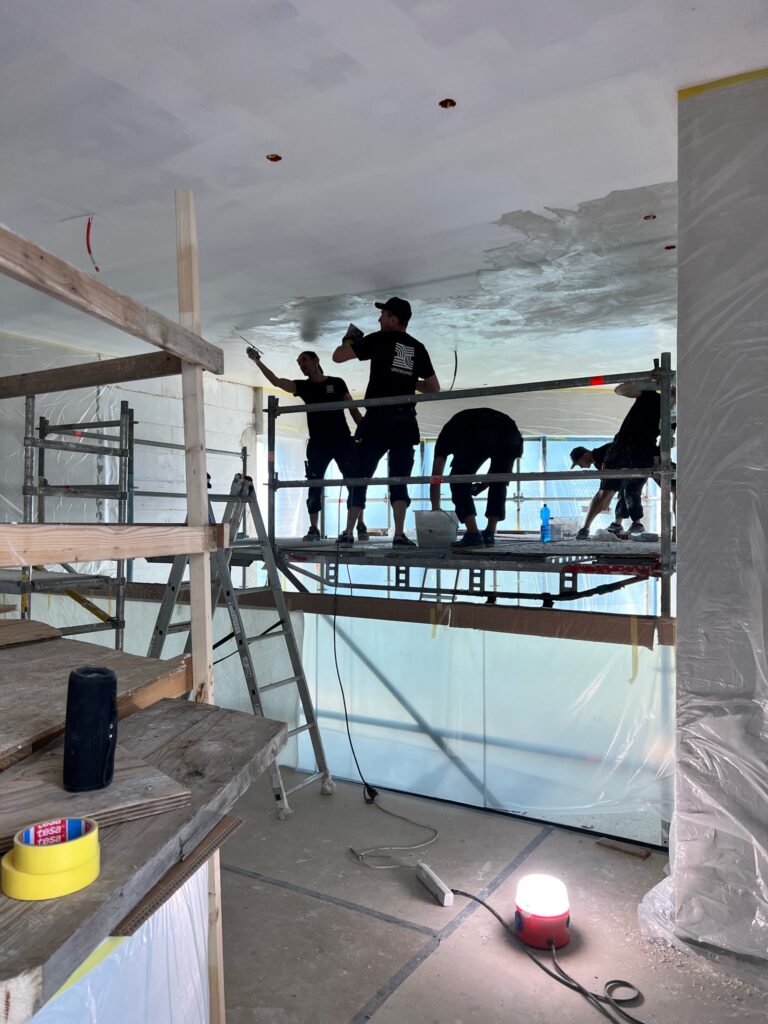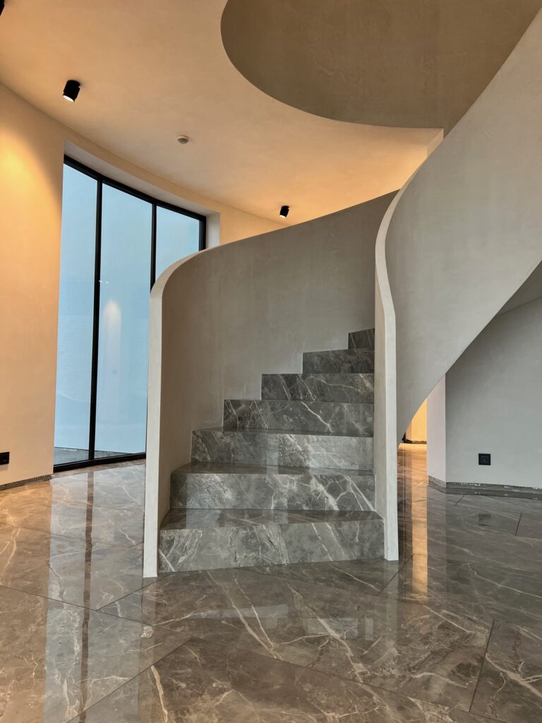 I detta projekt har vi noggrant förberett och utfört putsarbeten på omkring 500 kvadratmeter, täckande nästan hela villan – undantaget badrum och sovrum för att behålla en harmonisk balans.