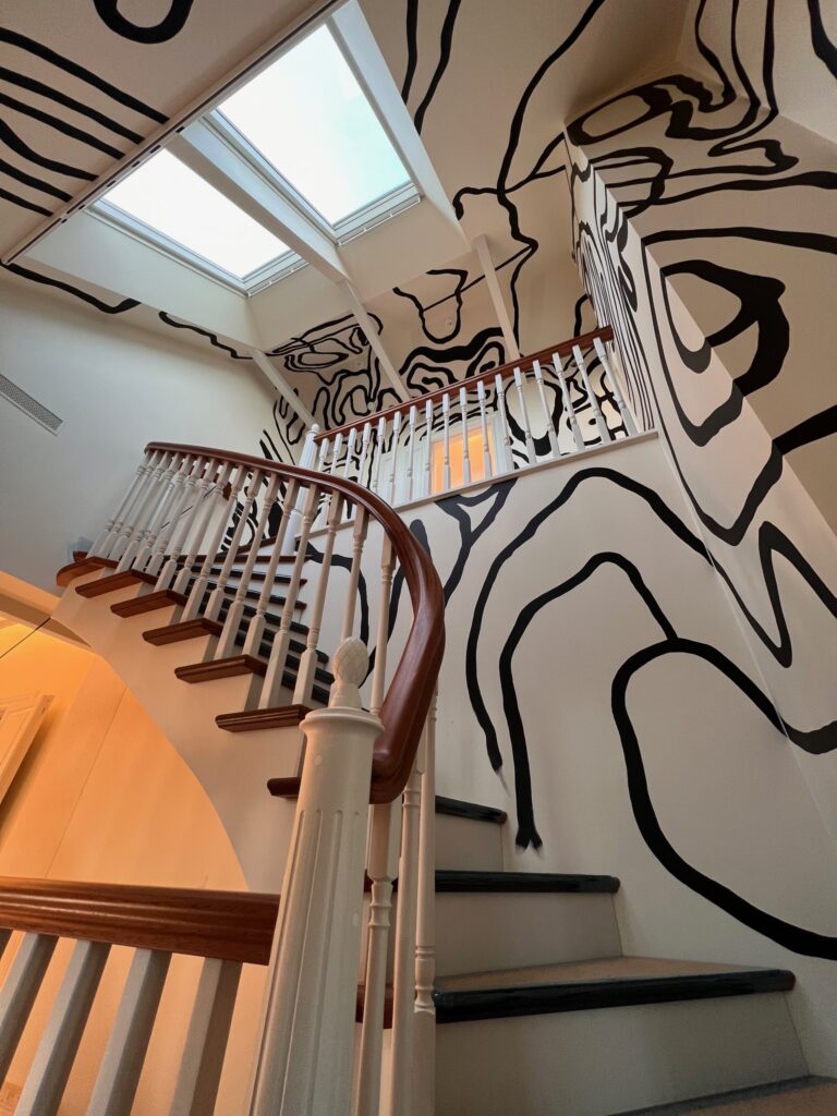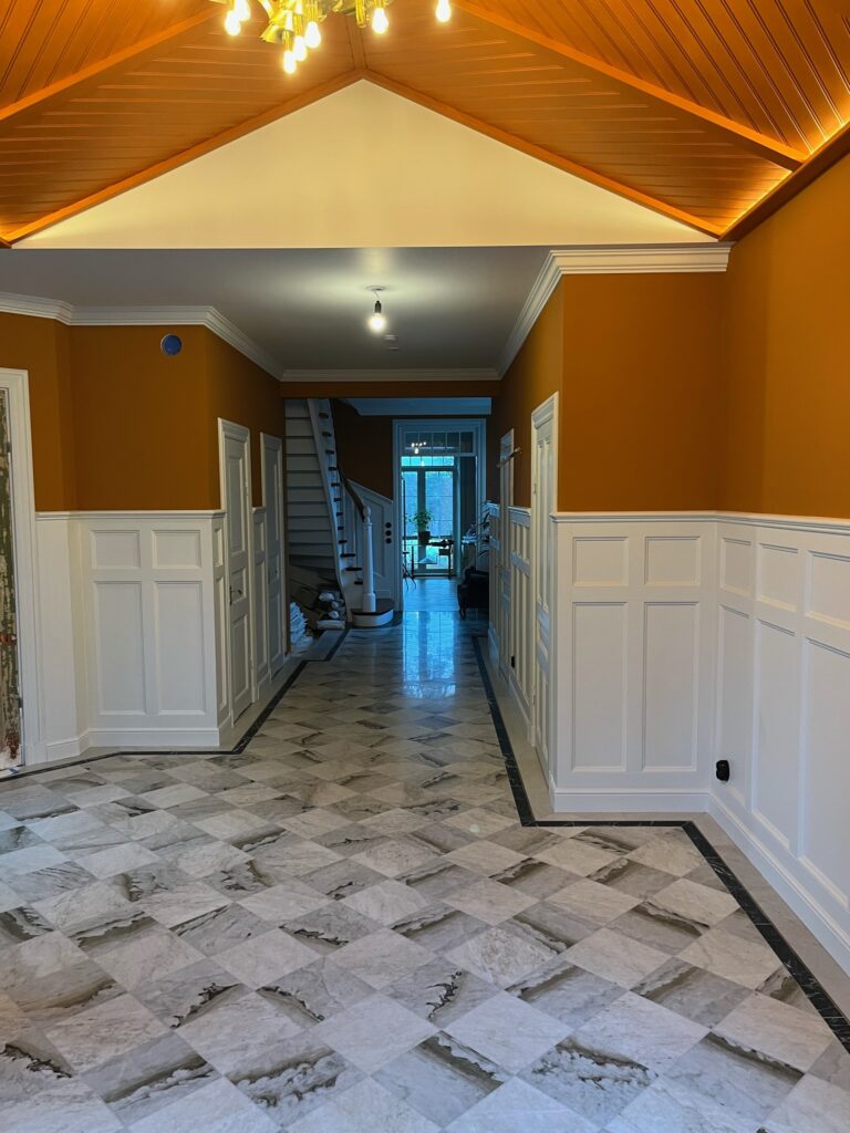I en villa från 1700-talet i Djursholm genomförde vi en renovering där varje beslut fattades med husets historia som utgångspunkt. Handmålade väggpaneler i massiv furu löper genom hela entréhallen, längs trappan upp till övervåningen och ned till källaren. Ett genomgående grepp som ger huset en känsla av kontinuitet och värdighet. I burspråket byggdes en platsbyggd sitsbänk som tillför både funktion och karaktär till entréns naturliga mittpunkt.
