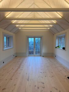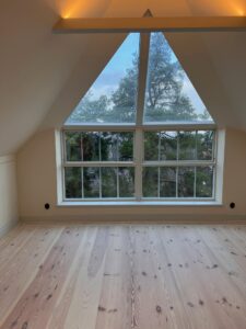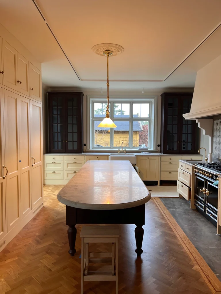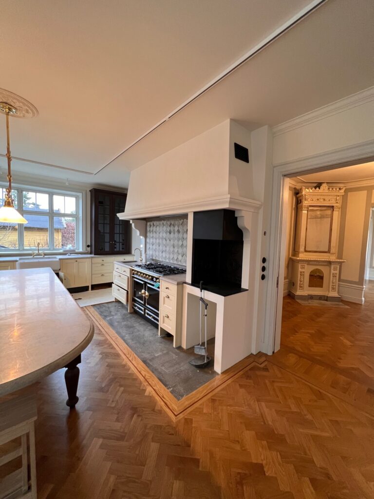 Undertaket i allrum och hall kläddes med perlspånt i chevronmönster som visuellt lyfter takhöjden och tillför en subtil elegans utan att konkurrera med husets klassiska drag. Golven lades i massiv furu från Dinesen med plankor på hela 8 meter – ett materialval som inte bara matchar husets ålder utan också håller sin skönhet i generationer framöver.